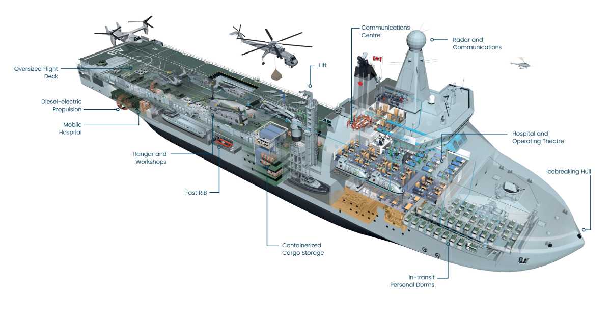 Comme l’ont montré les événements récents, la guerre, même entre États souverains, demeure une menace. Parallèlement, les opérations antiterroristes, anti-insurrectionnelles, humanitaires et de secours en cas de catastrophe occupent une place de plus en plus importante. Bien que les frégates aient historiquement été la plateforme la plus utilisée dans la flotte navale, ce sont les navires polyvalents qui le sont aujourd’hui. Le G-LAM est un navire de soutien polyvalent conçu pour soutenir la politique étrangère du Canada dans un paysage géopolitique et climatique mondial en pleine transformation, en donnant la priorité au maintien de la paix, à l’aide humanitaire et aux efforts de secours en cas de catastrophe.